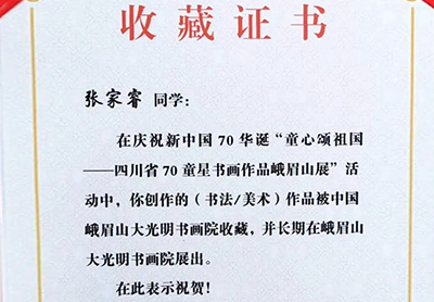 衡川學(xué)子張家睿美術(shù)作品《愛我九州》入選由中國美術(shù)家協(xié)會、中國民族文化藝術(shù)基金會共同主辦的“...