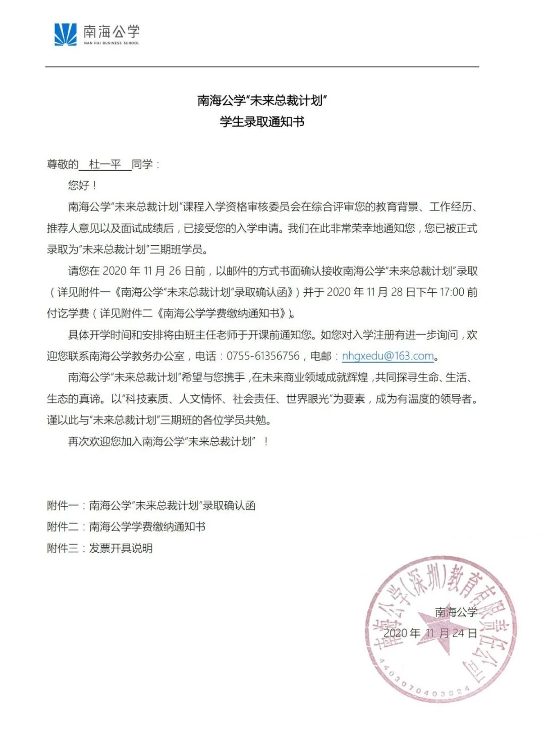 被南海公學正式錄取為